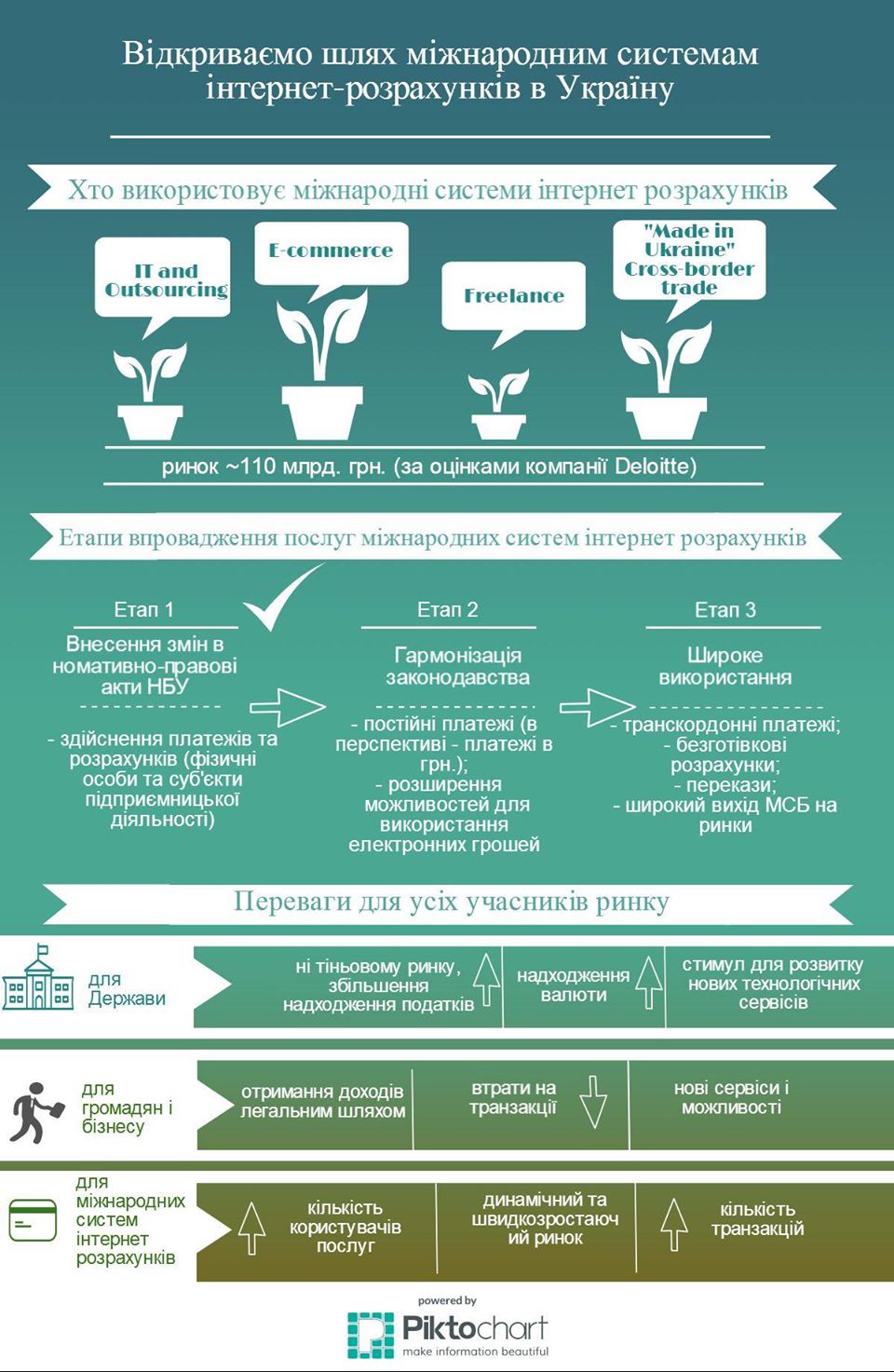 Нацбанк повідомляє, що наразі “визначено умови внесення до Реєстру платіжних систем, систем розрахунків, учаcників цих систем та операторів послуг платіжної інфраструктури відомостей про міжнародні системи інтернет-розрахунків (такі як PayPal, ApplePay, GoogleWallet та ін.), що створює підґрунтя для започаткування діяльності в Україні таких міжнародних систем”.