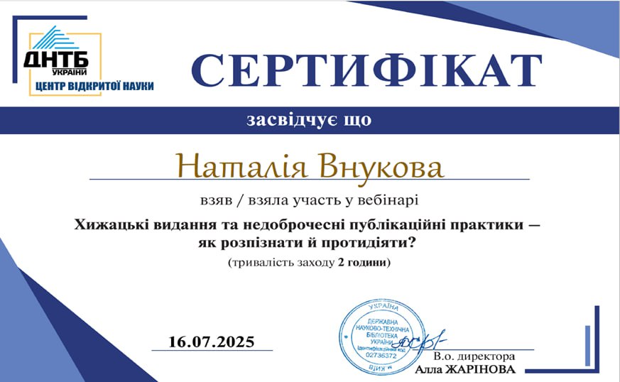 У липні 2025 року провідний науковий співробітник НДІ ПЗІР НАПрН України, головний редактор електронного видання «Право та інноваційне суспільство» Наталія Внукова взяла участь у конференції ДНТБ України «Хижацькі видання та недоброчесні публікаційні практики — як розпізнати й протидіяти?».