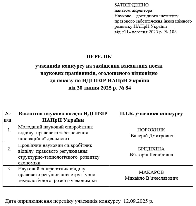 Перелік учасників конкурсу на заміщення вакантних посад наукових працівників, оголошеного відповідно до наказу по НДІ ПЗІР НАПрН України від 30 липня 2025 р. № 84