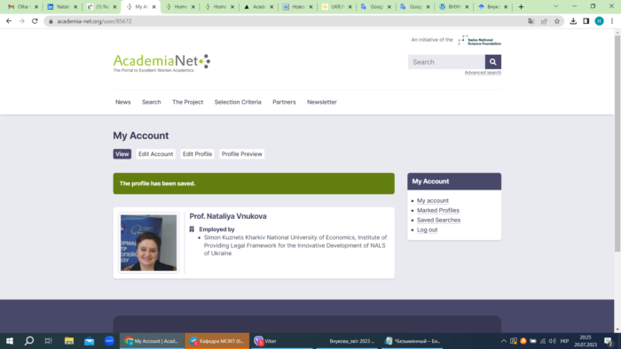 Провідний науковий співробітник НДІ правового забезпечення інноваційного розвитку д.е.н., проф Наталія Внукова була номінована на AcademiaNet – міжнародна база даних, яка наразі містить понад 3500 профілів висококваліфікованих жінок у наукових колах. Окрім бази даних, на сайті www.academia-net.org розміщені новини та доповіді про жінок у науці. AcademiaNet є некомерційним проектом, безкоштовним для користувачів і учасників і без реклами. Проєкт був ініційований у Німеччині Фондом Роберта Боша у 2010 році. З 2020 року AcademiaNet керує Швейцарський національний науковий фонд (SNSF). Видавництво Спектрум der Wissenschaft Publishing (Гейдельберг, Німеччина) керує веб-сайтом від імені SNSF. SNSF, Robert Bosch Stiftung і 20 європейських наукових організацій, таких як Королівське товариство Единбург, Національна дослідницька рада Іспанії та Національний дослідницький фонд Данії забезпечують фінансування AcademiaNet. Понад 40 відомих дослідницьких організацій, як-от Французьке національне дослідницьке агентство, Інститут Вейцмана чи Асоціація Гельмгольца, підтримують AcademiaNet, призначаючи видатну жінку дослідницю для бази даних. Ключем до ідеї AcademiaNet є жорсткі критерії відбору. Тільки відомі партнерські організації від європейського дослідницького співтовариства мають право номінувати вчених для бази даних. Вони призначають жінок для AcademiaNet